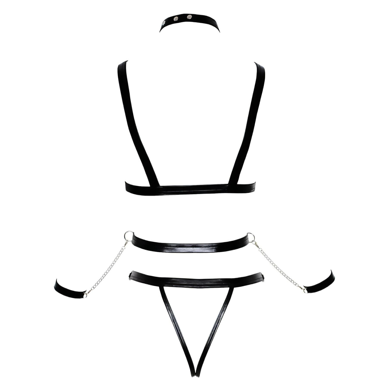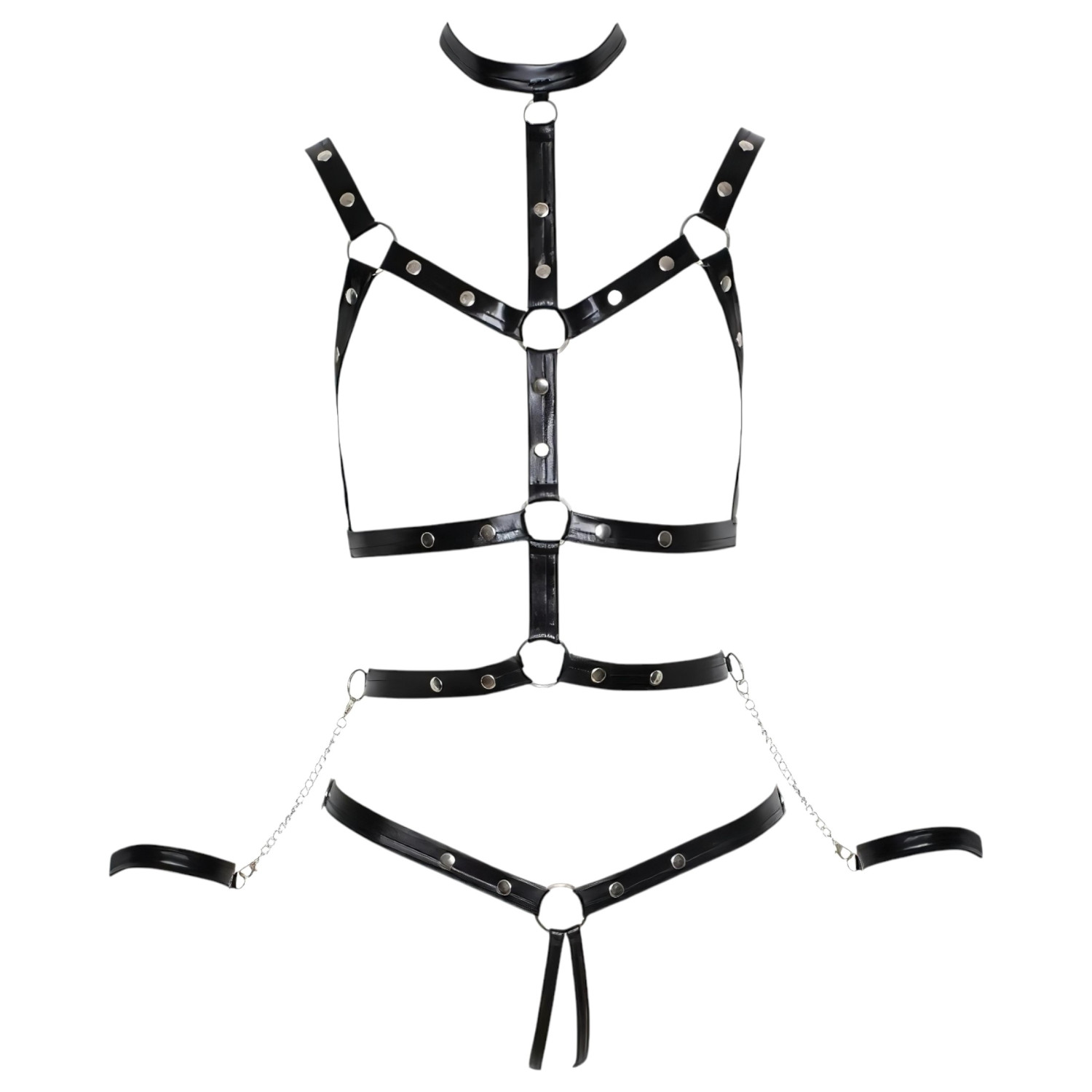 Odkryj świat uwodzenia i bondage z tym wyjątkowym, dwuczęściowym body o stylu uprzęży, ozdobionym dekoracyjnymi ćwiekami.